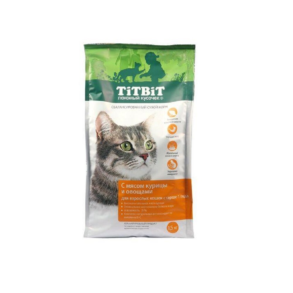 Корм сухой для взрослых кошек TiTBiT полнорационный, с мясом курицы и овощами 1,5 кг
