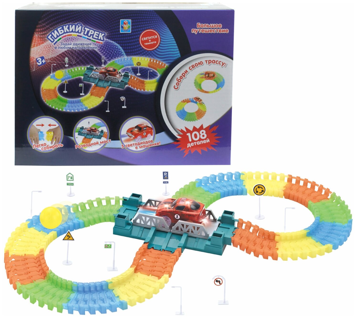 Купить Игровой набор 1TOY Гибкий трек "Большое путешествие", 108 деталей, дорога светится в темноте