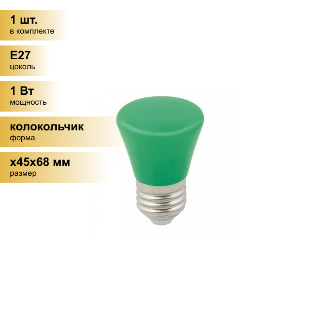 (10 шт.) Светодиодная лампочка Лампа св/д Volpe колокольчик E27 1W зеленая д/гирлянды "Белт Лайт" LED-D45-1W/GREEN/E27/FR/С BELL . Цоколь E27
