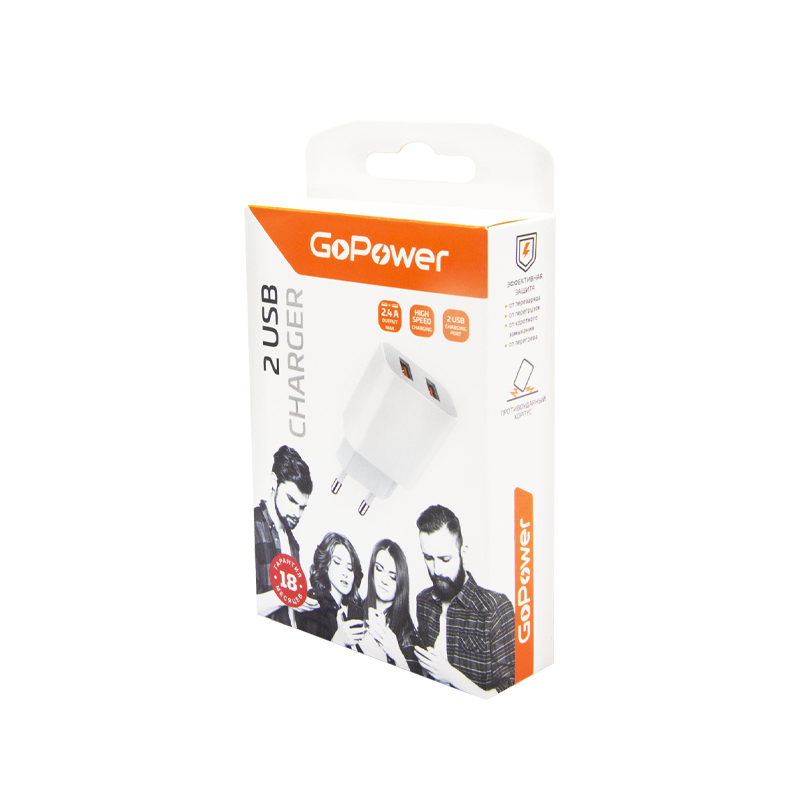 Сетевое зарядное устройство GoPower 2 USB 2.4A 12W Белое Модель GP2U