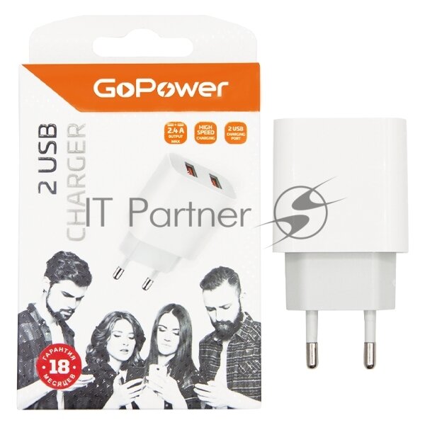 GoPower Зарядное устройство GoPower GP2U 00-00018570, 2xUSB 2.4А, белый (ret)