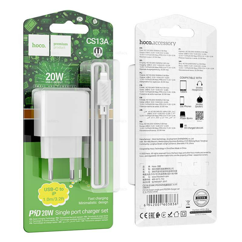 Купить Зарядное устройство Hoco CS13A, белый (PD, 1xUSB-C, 20W, кабель Type-C - 8pin)
