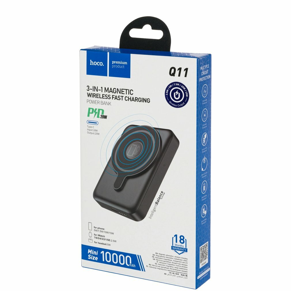 Купить Универсальный Доп. Аккумулятор 10000mAh, Q11, HOCO, выход: беспроводная зарядка+1 PD (20W), черный