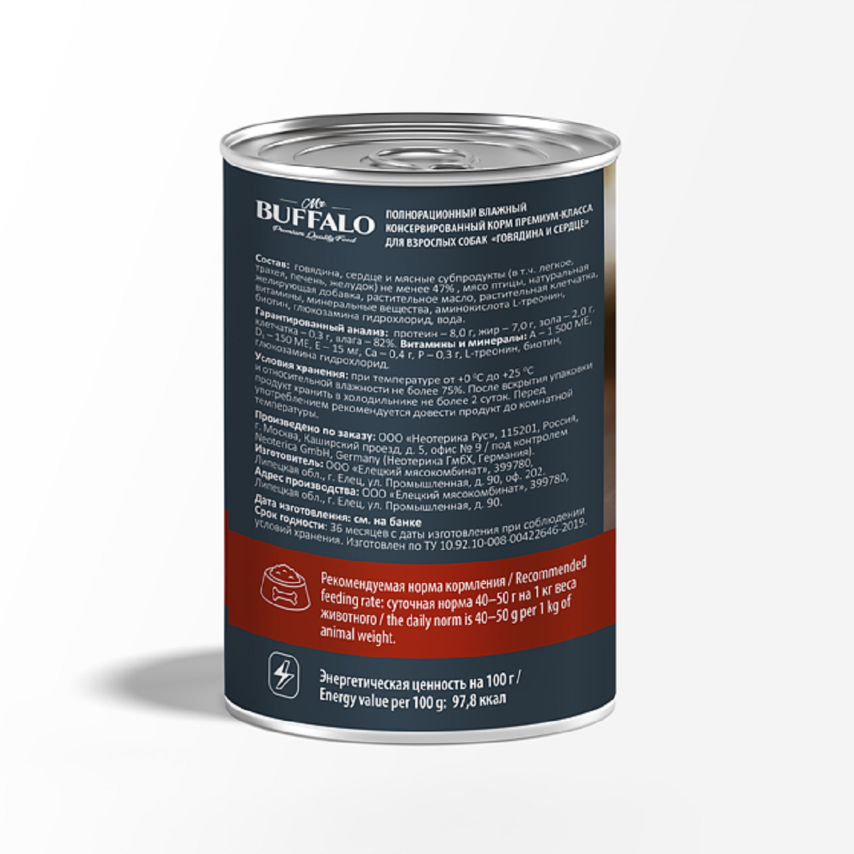 Консервы Мистер Бафало для взрослых собак Говядина и сердце (цена за упаковку) 400г х 9шт