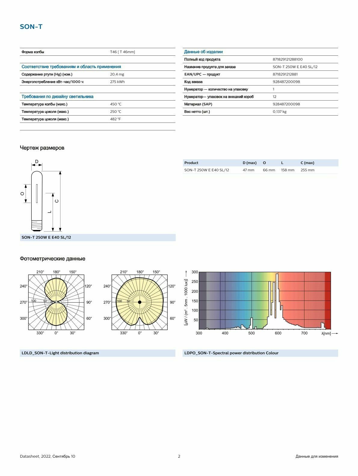 Лампа газоразрядная Philips SON-T SL/12, E40, T47, 250 Вт, 2000 К