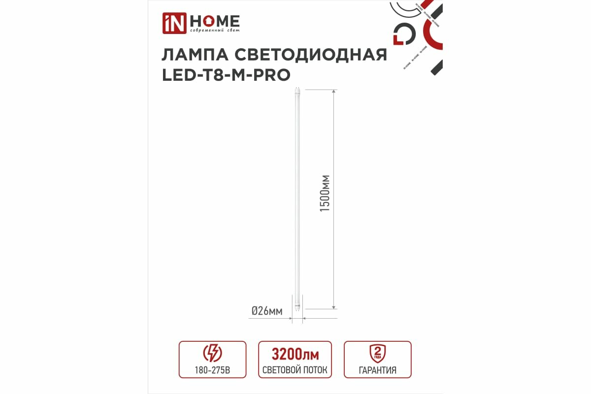 IN HOME Лампа сд LED-T8-М-PRO 32Вт 230В G13 6500К 3200Лм 1500мм матовая 4690612031040