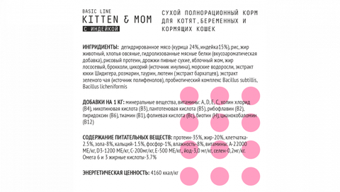 | Состав | дегидрированное мясо (курица 24%, индейка15%), рис, жир животный, хлопья овсяные, гидролизованные мясные белки (вкусоароматическая добавка), рисовый протеин, дрожжи пивные сухие, яблочный жом, жир лососевый, брокколи, цикорий (источник инулина), морские водоросли, экстракт юкки Шидигера, розмарин, таурин, лютеин (экстракт бархатцев), экстракт зеленого чая (источник полифенолов), пробиотический комплекс Bacillus subtillis, Bacillus licheniformis |