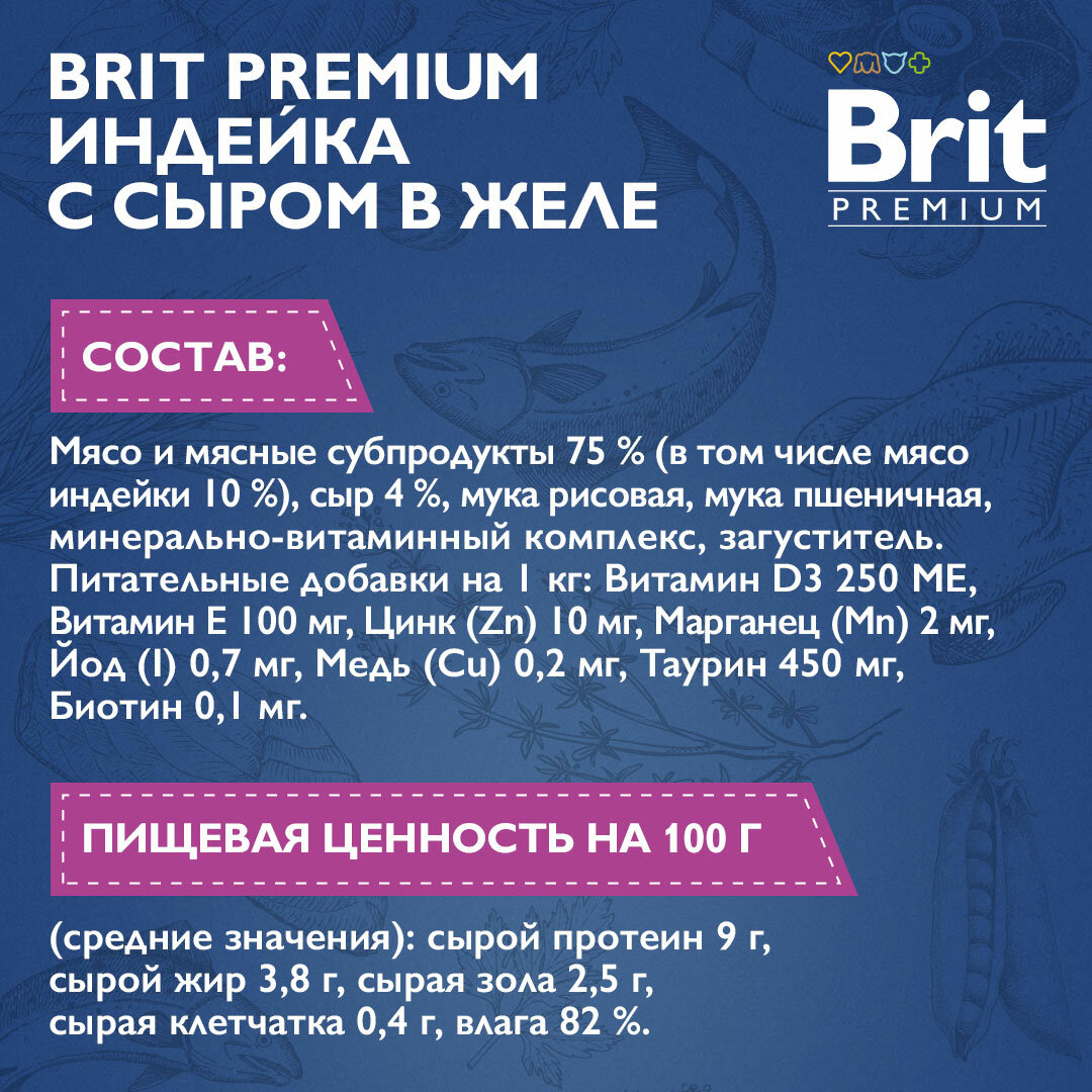 BRIT PREMIUM для взр кастр котов и стер кошек с индейкой и сыром в желе пауч 85 гр 85 гр х 4 шт