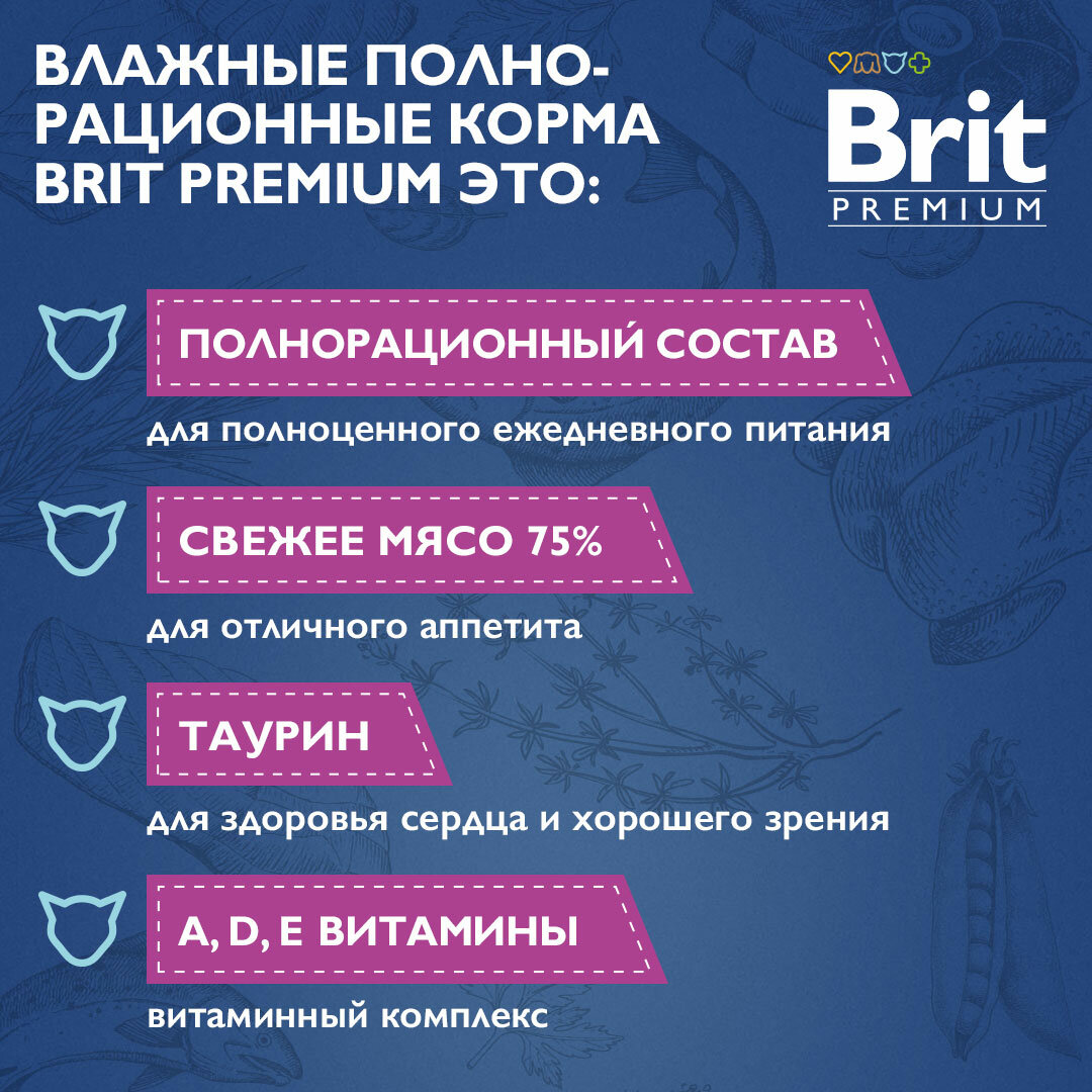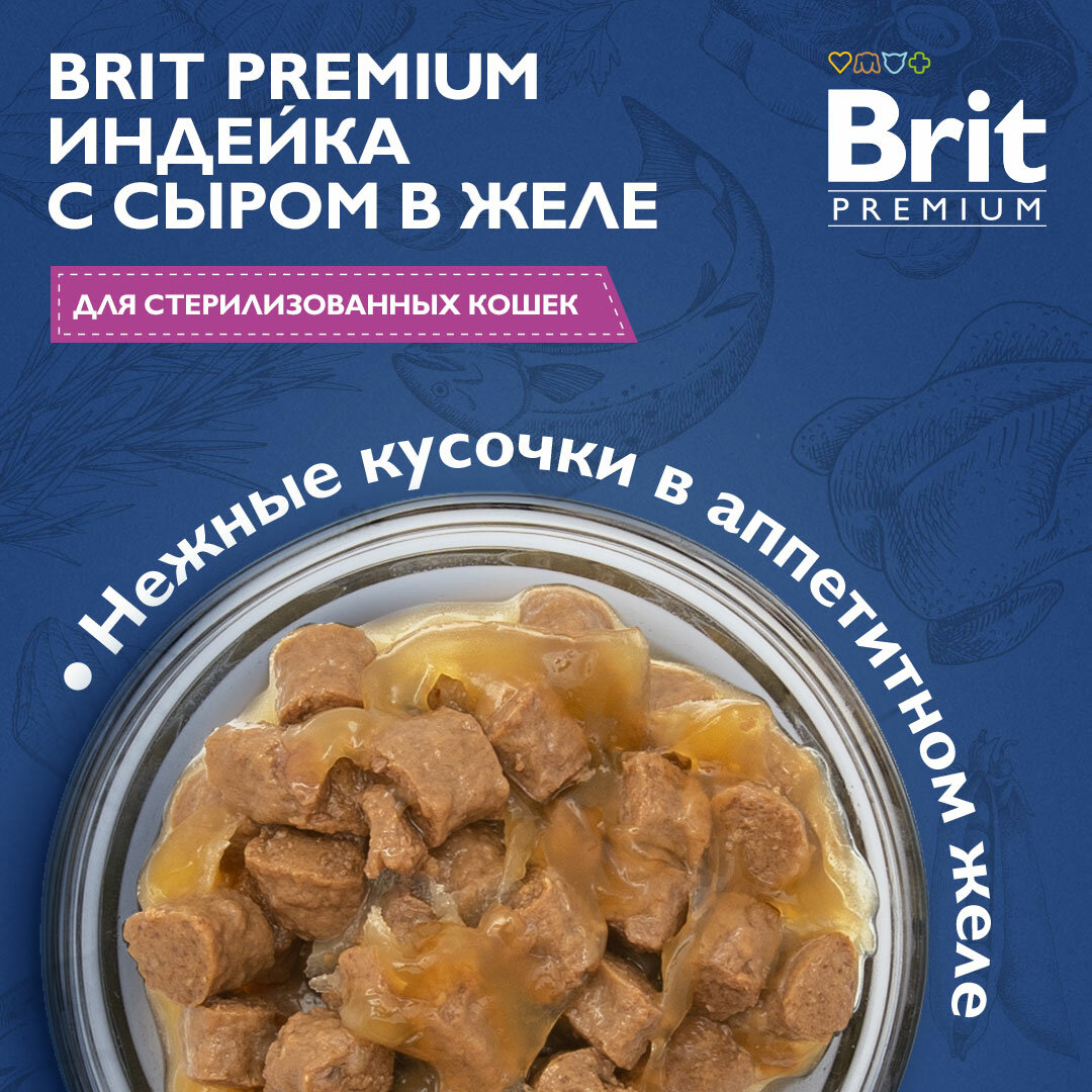 BRIT PREMIUM, Влажный корм для взрослых стерилизованных кошек, Индейка с сыром в желе, 85г x 14шт