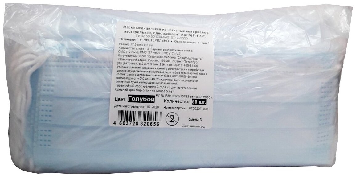 СпецМедЗащита, маски медицинские, трехслойные, голубые, 50 шт