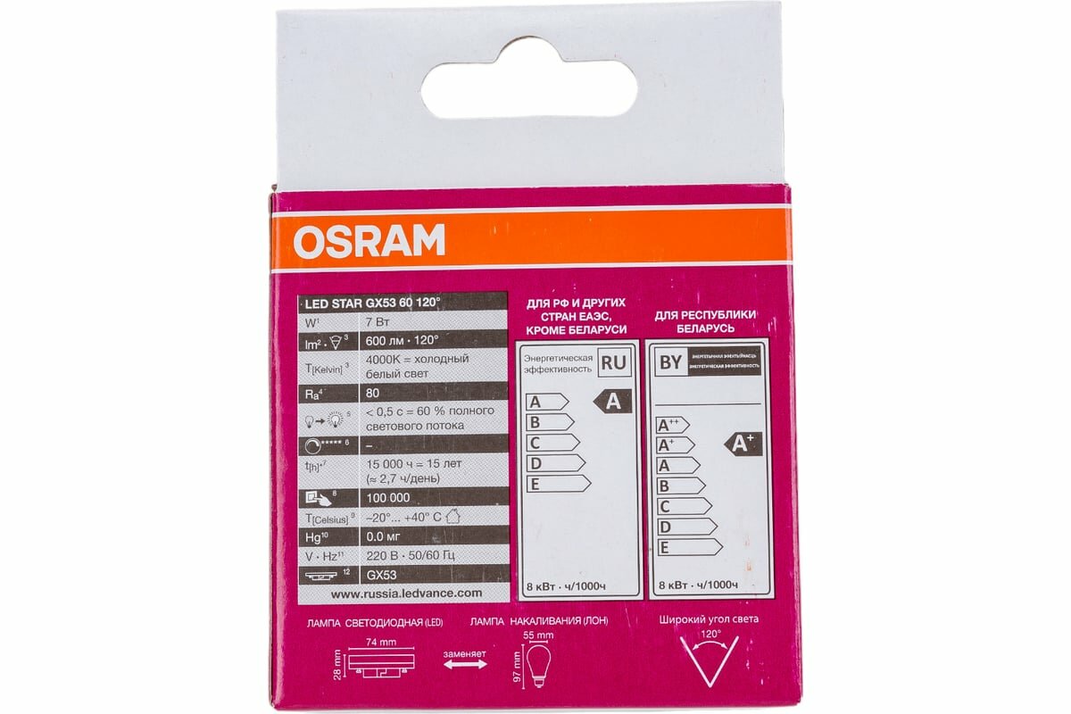 Лампочка светодиодная OSRAM LED Star GX, 550лм, 7Вт, 4000К нейтральный свет, Цоколь GX53, колба GX, таблетка