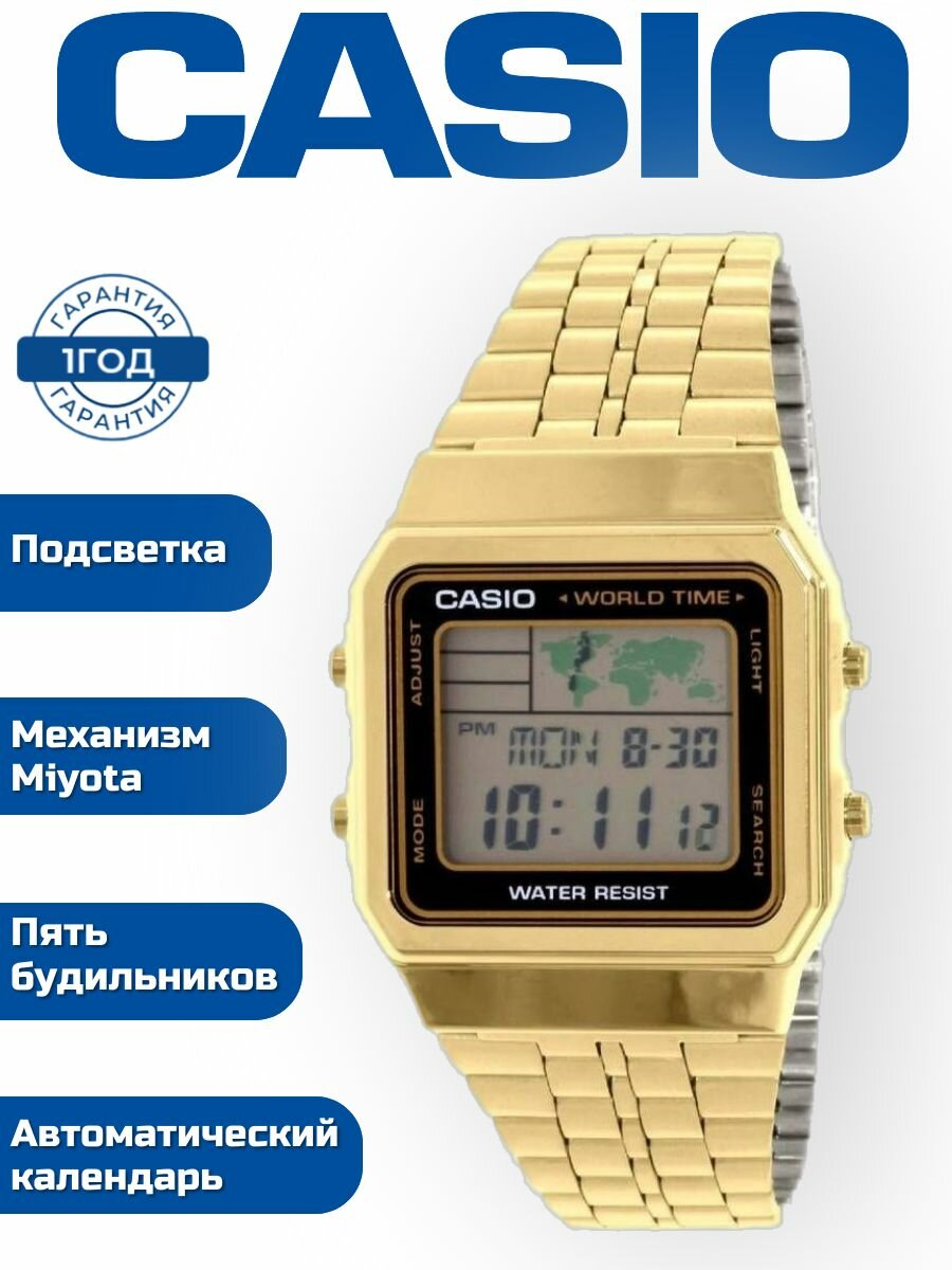 Наручные часы CASIO A-500WGA-9E мужские, кварцевые, будильник, секундомер, таймер обратного отсчета, водонепроницаемые, подсветка дисплея, золотой