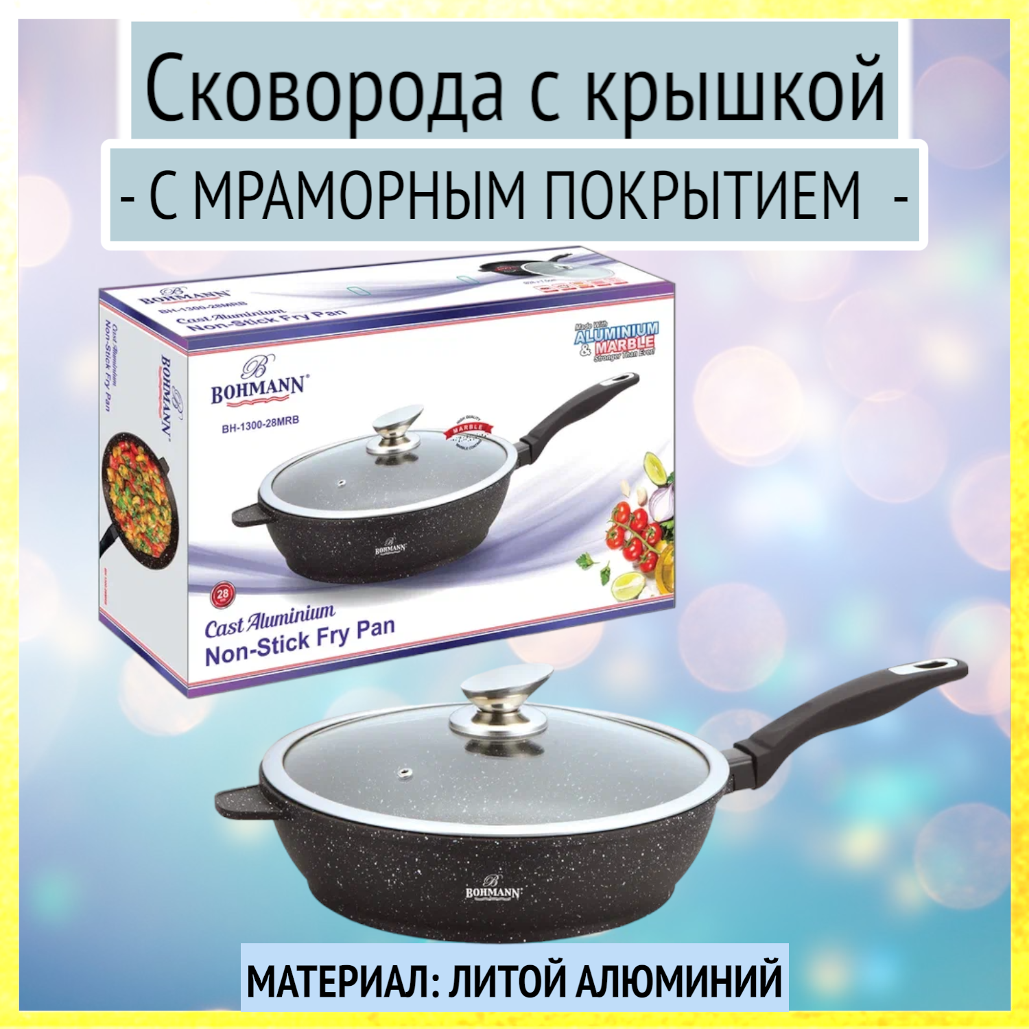 Сковорода 28 см алюминиевая с крышкой, с мраморным покрытием, Bohmann, BH-1300MRB