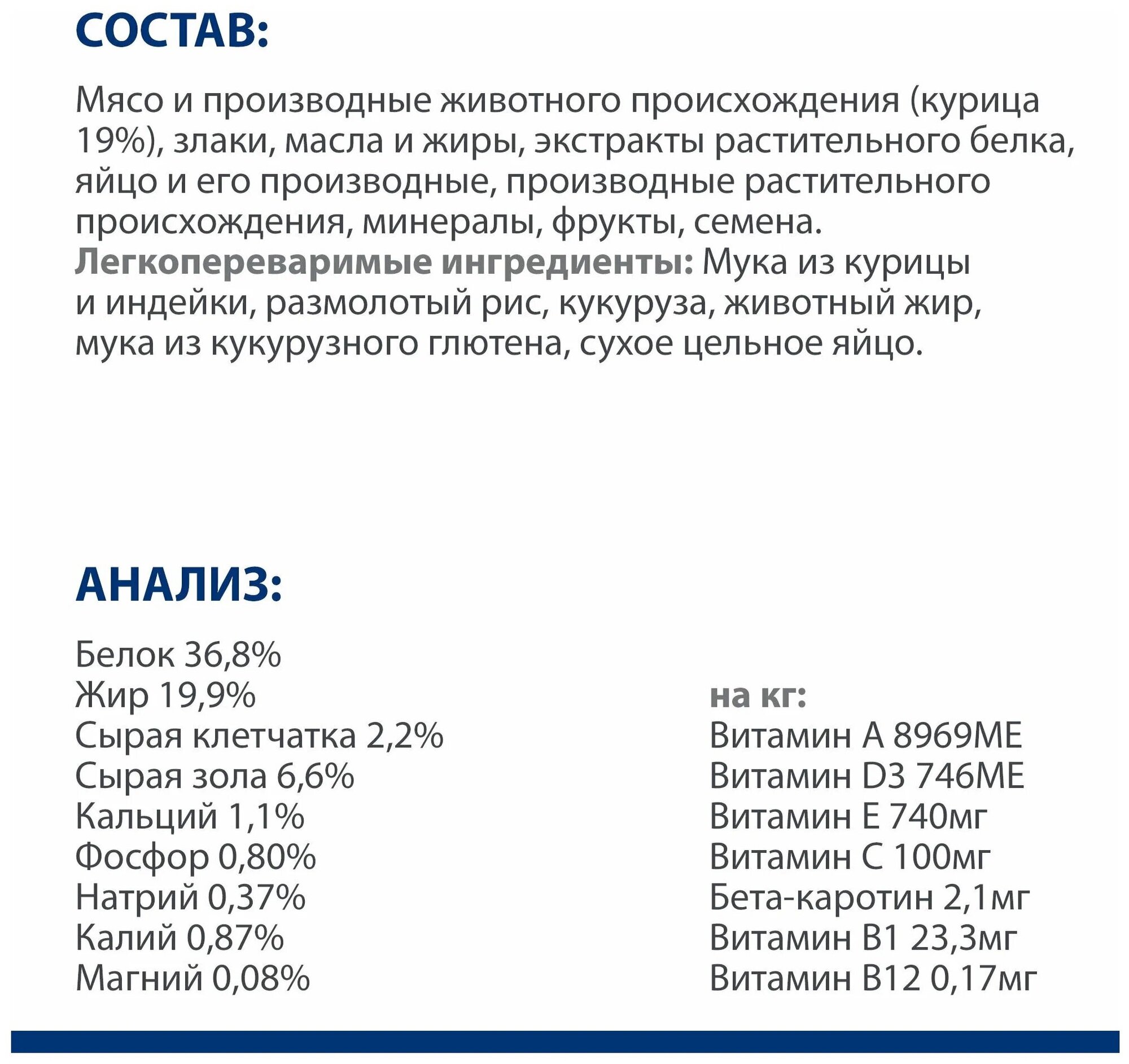 | Состав | злаки, мясо (курица 37%) и производные животного происхождения, масла и жиры, экстракты растительного белка, яйцо и его производные, минералы, производные растительного происхождения. Легкоусваиваемые ингредиенты: Мука из курицы и индейки, размолотый рис, кукуруза, животный жир, мука из кукурузного глютена, сухое цельное яйцо. |
