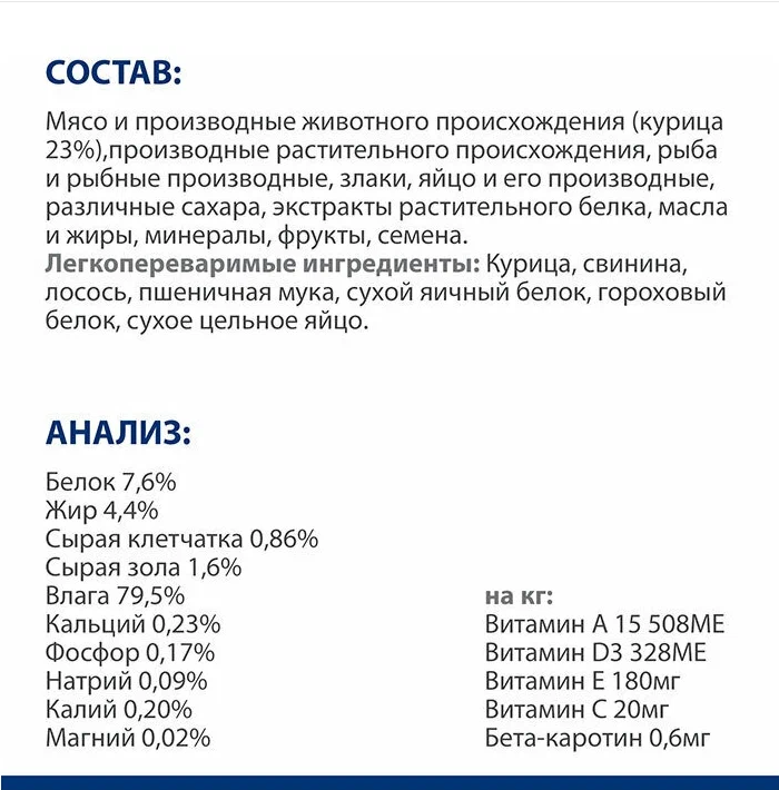 | Состав | мясо и производные животного происхождения (курица 23%), производные растительного происхождения, рыба и рыбные производные, злаки, яйцо и его производные, различные сахара, экстракты растительного белка, масла и жиры, минералы, фрукты, семена. Легкопереваримые ингредиенты: курица, свинина, лосось, пшеничная мука, сухой яичный белок, гороховый белок, сухое цельное яйцо |