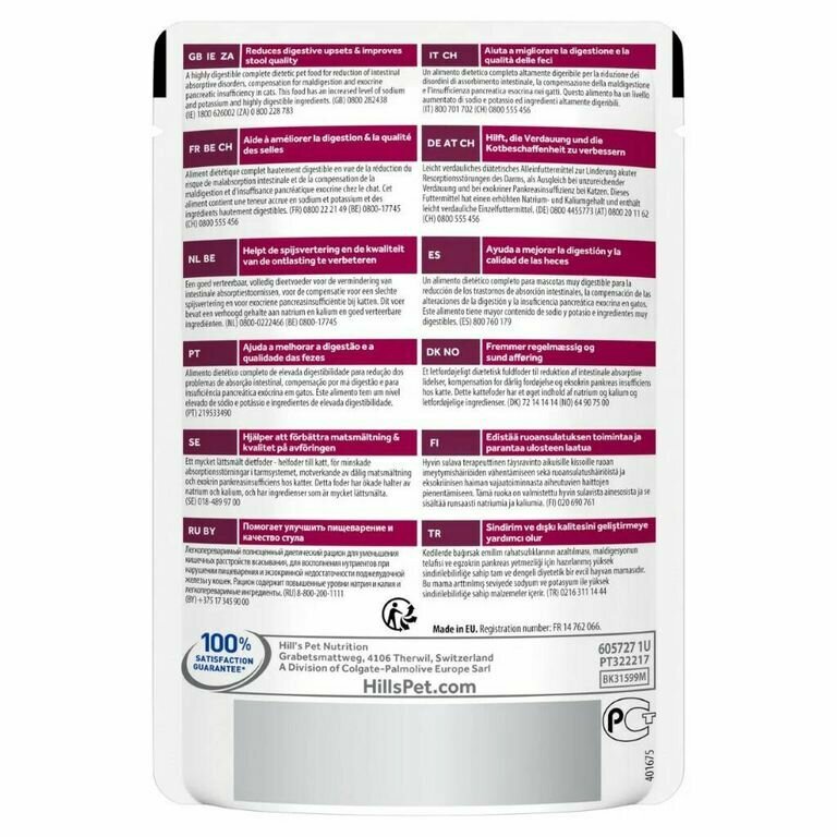 | Дополнительная информация | показания: при острых и хронических заболеваниях ЖКТ, при заболеваниях ЖКТ у котят, при сниженной перистальтике толстого кишечника/ расширении толстого кишечника (мегаколоне), при недостаточности пищеварения и нарушении всасывания, в период восстановления, при панкреатитах; не рекомендуется кошкам с задержкой натрия в организме; окрашено натуральной карамелью; без искусственных ароматизаторов, красителей и консервантов |