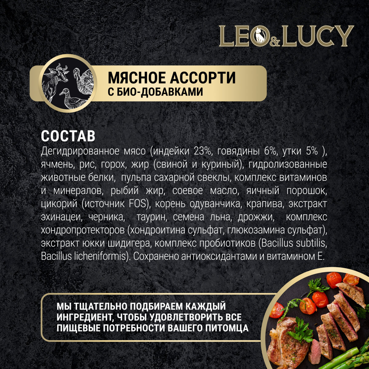 LEO&LUCY сухой холистик корм полнорационный для взрослых кошек мясное ассорти и биодобавками, подходит для стерилизованных, 1,5 кг