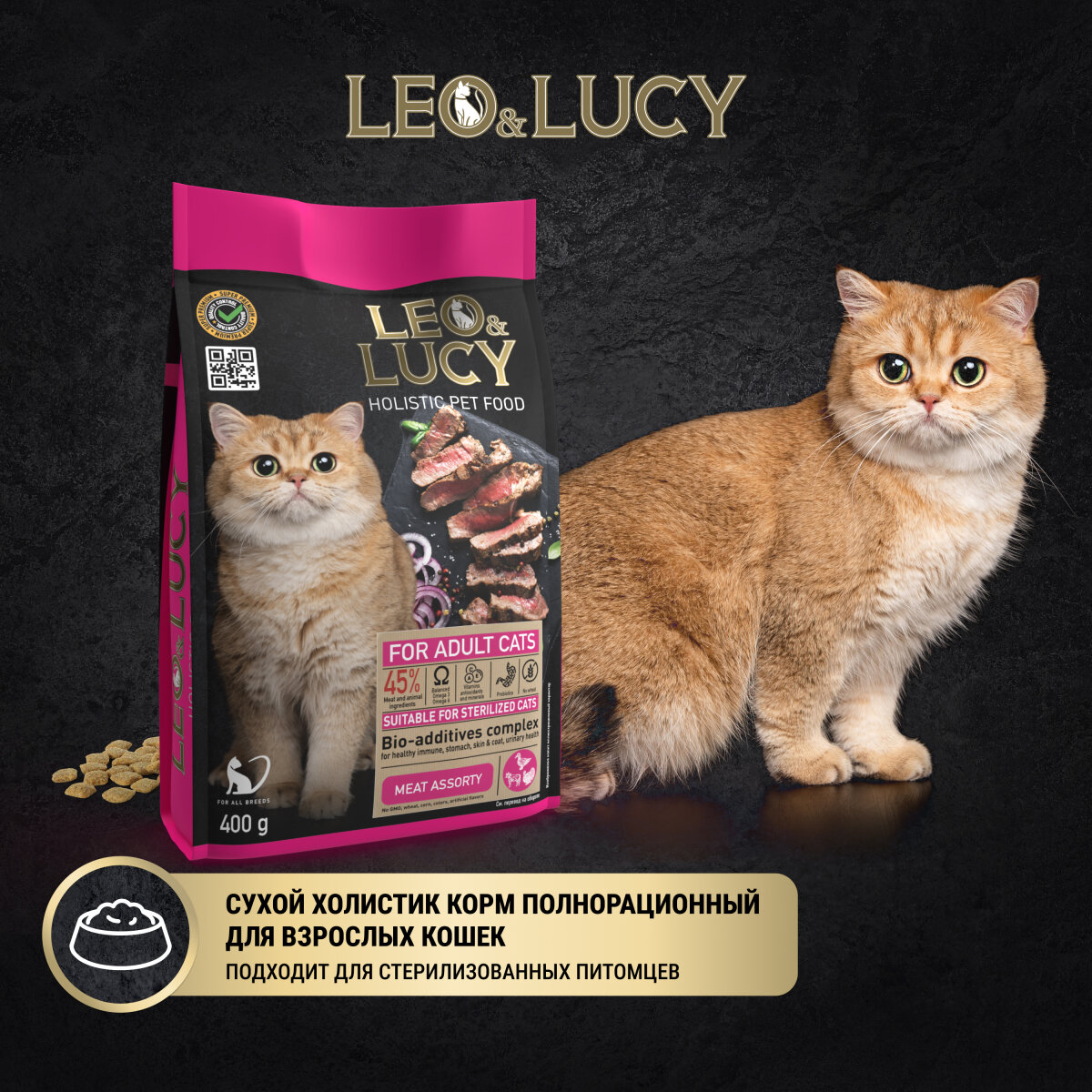 Купить LEO&LUCY сухой холистик корм полнорационный для взрослых кошек мясное ассорти и биодобавками, подходит для стерилизованных, 400 г