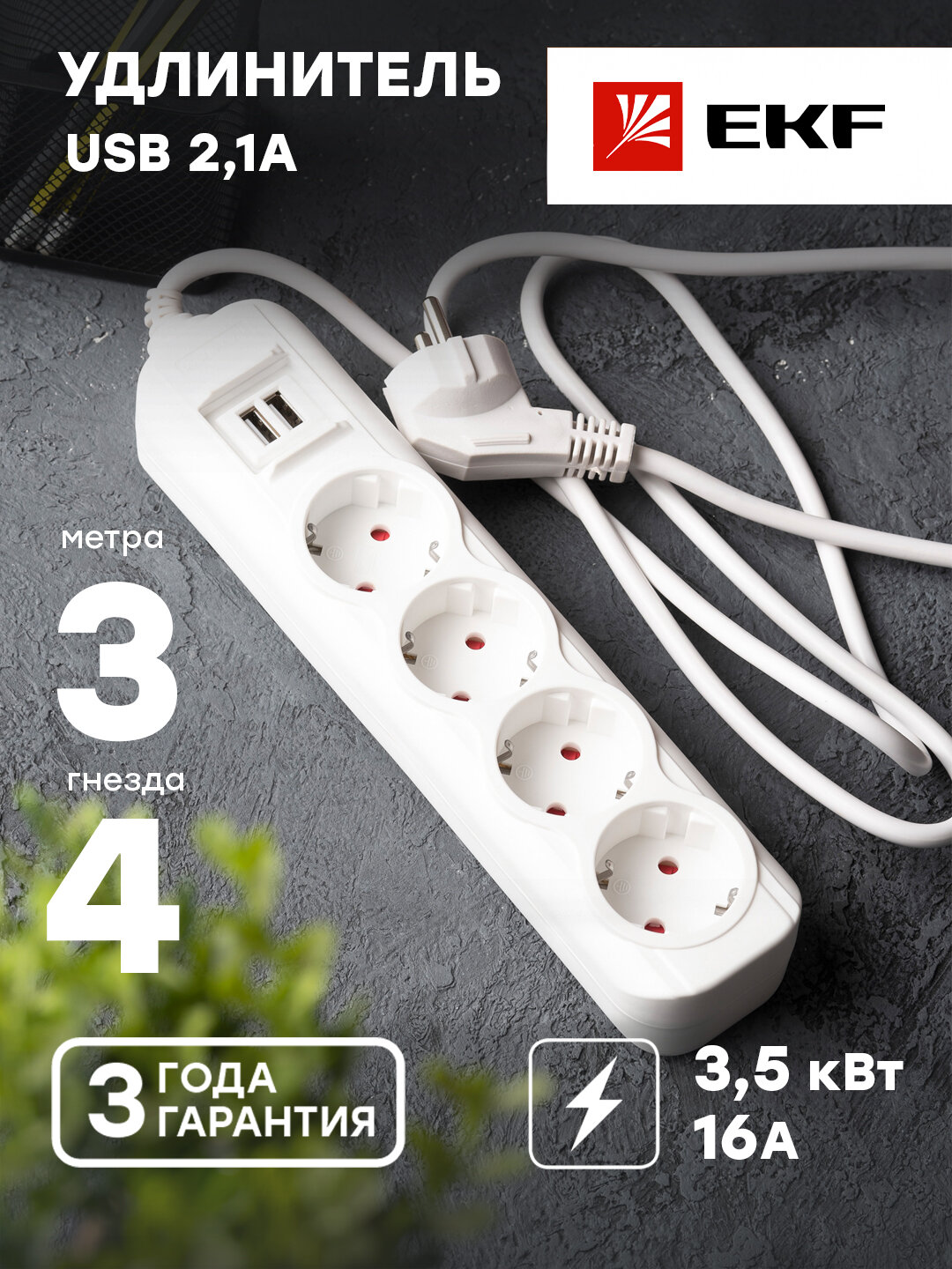 Удлинитель Эксперт 4 гнезда 3 м EKF ПВС 3x1 16A 2 USB интересное: