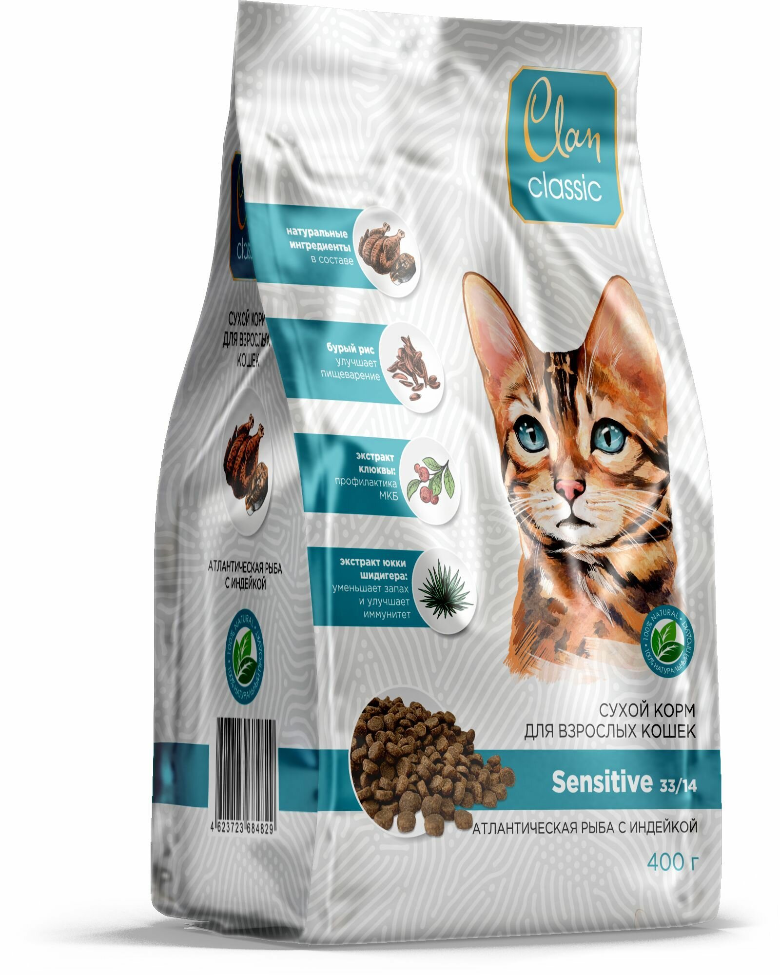 Сухой корм CLAN CLASSIC Sensitive 33/14 для кошек с чувствительным пищеварением, атлантическая рыба, индейка 400г