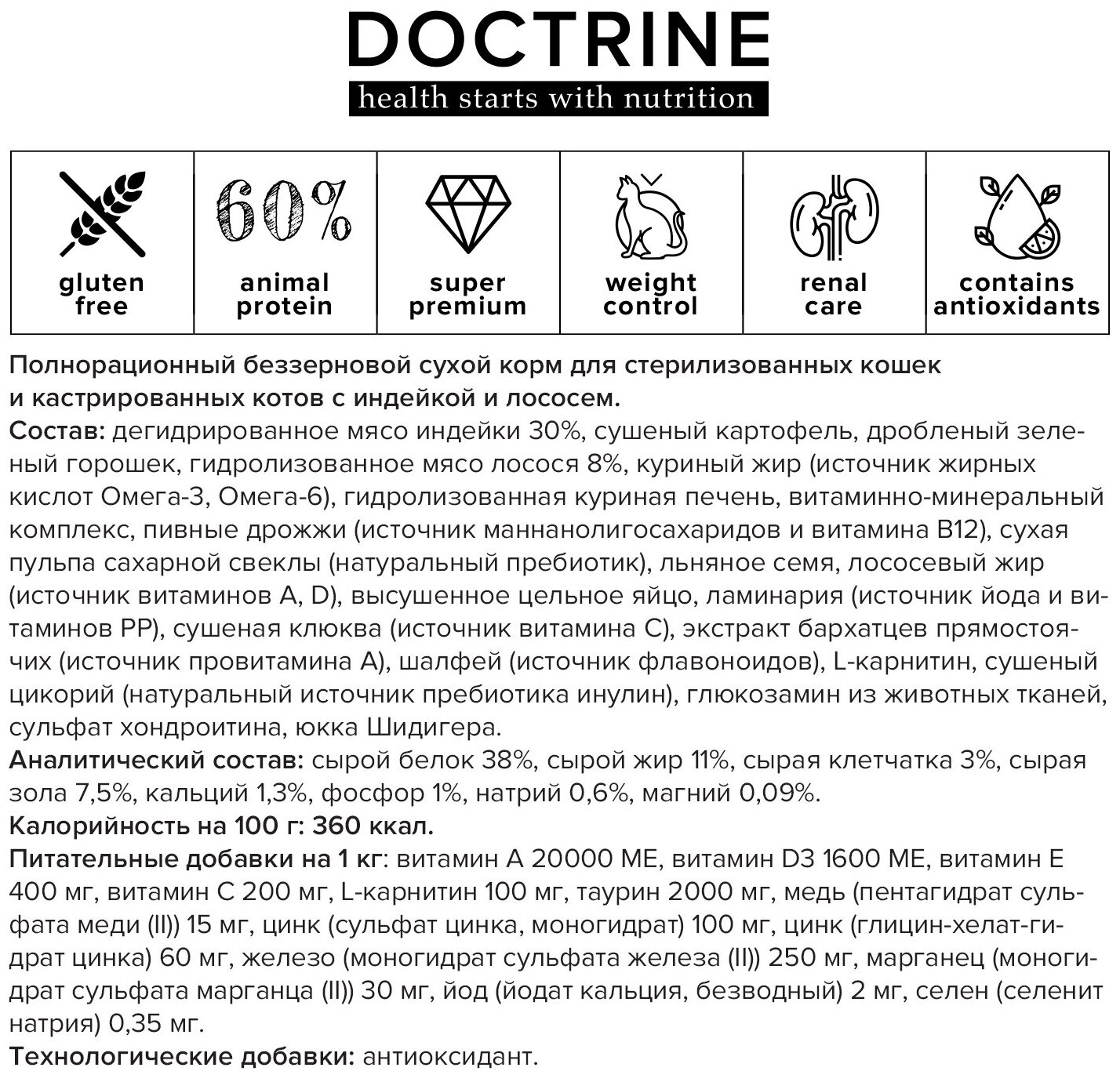DOCTRINE Полнорационный беззерновой сухой корм для стерилизованных кошек и кастрированных котов с индейкой и лососем 3кг