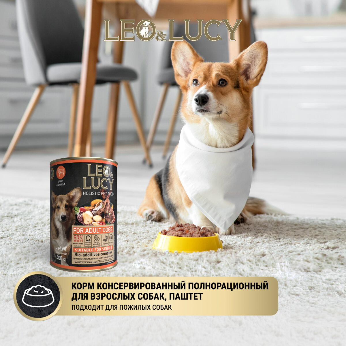Влажный холистик корм для взрослых собак всех пород LEO&LUCY консервированный с ягненком, грушей и биодобавками, подходит для пожилых, 400 г