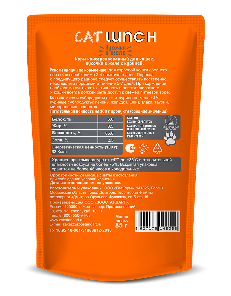 Влажный корм для кошек Cat Lunch кусочки в желе с Курицей, пауч 85гх24шт интересное: