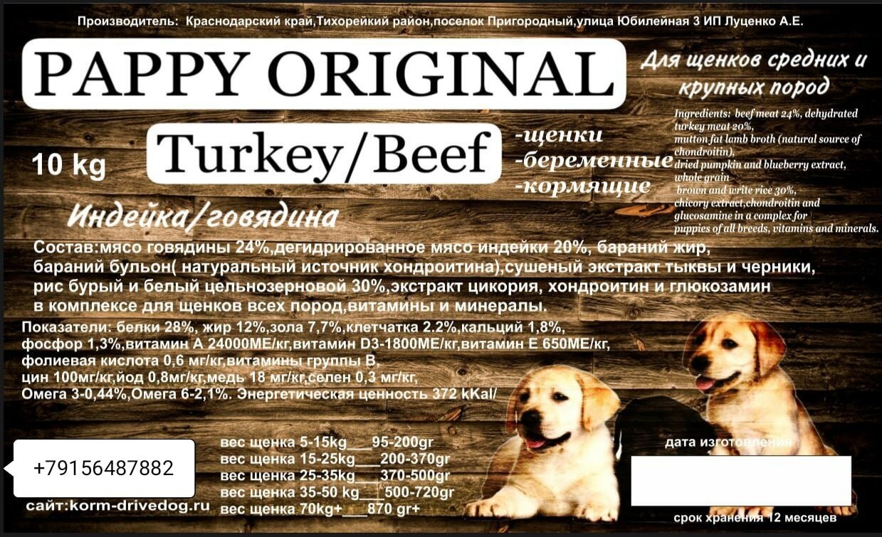 Сухой корм для щенков средних и крупных пород Drive Dog PAPPY ORIGINAL Индейка с Говядиной 10кг