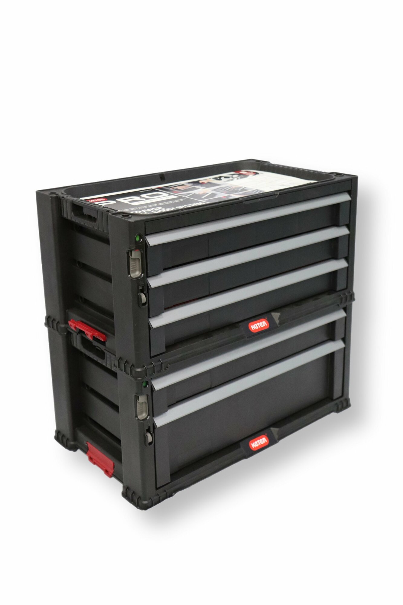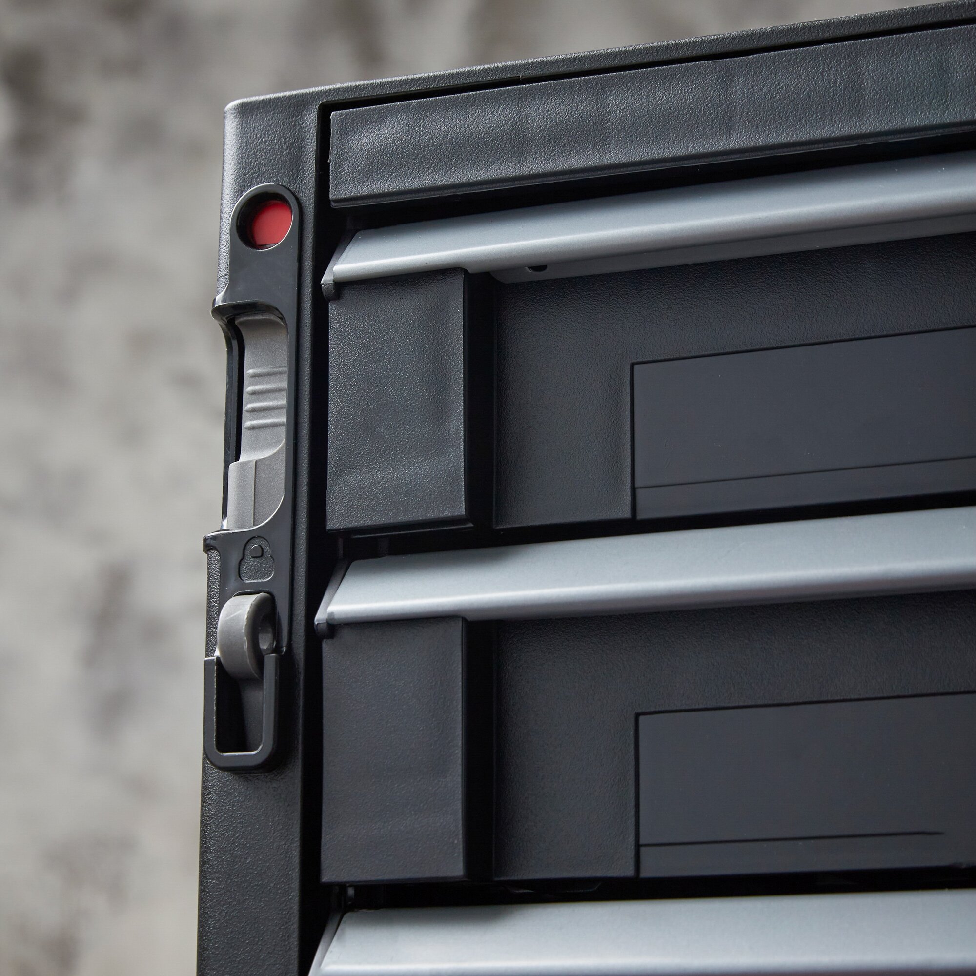 | Дополнительная информация | надежное и универсальное складирование, запорная система с центральным замком, 16 съемных ячеек для мелких деталей, съемные перегородки, встроенные ручки для переноски, фиксируемые шарнирные ролики, максимальный вес 50 кг |
