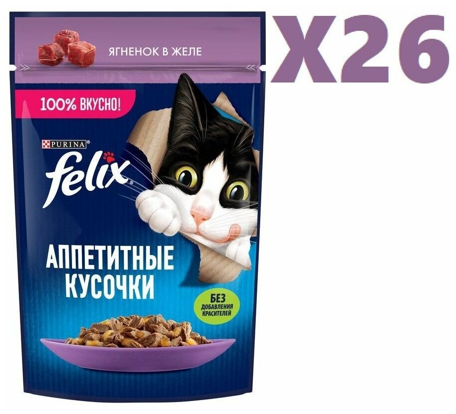 Felix Аппетитные кусочки полнорационный влажный корм для кошек, с ягненком, кусочки в желе, в паучах - 75 г х 26 шт