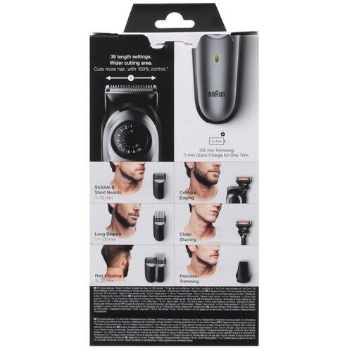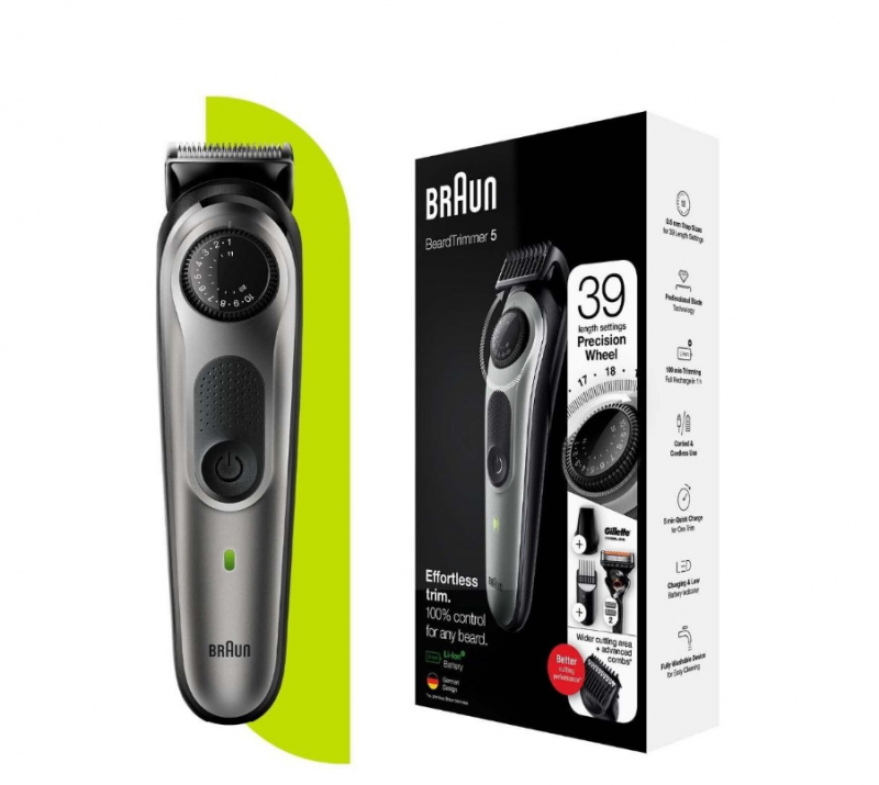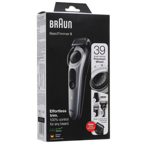 Триммер для бороды и усов Braun BT5360 + Бритва Gillette Fusion ProGlide, 3 насадки, 39 установок длины, Li-ion аккумулятор, светодиодный индикатор, черный / серый