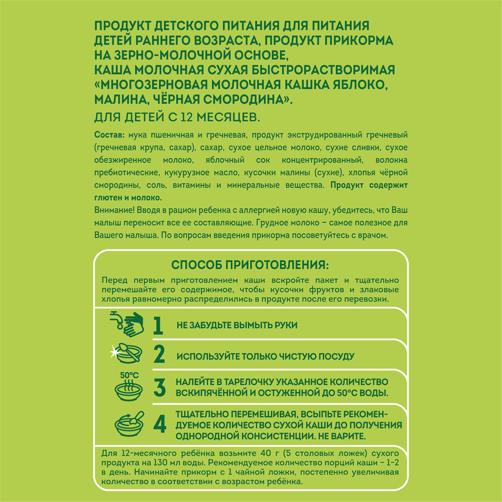 | Состав | пшеничная и гречневая мука, продукт экструдированный гречневый (гречневая крупа, сахар), сахар, сухое цельное молоко, сухие сливки, сухое обезжиренное молоко, яблочный сок концентрированный, волокна цикория пребиотические (инулин), кукурузное масло, кусочки малины (сухие), хлопья чёрной смородины, соль, витамины и минеральные вещества |