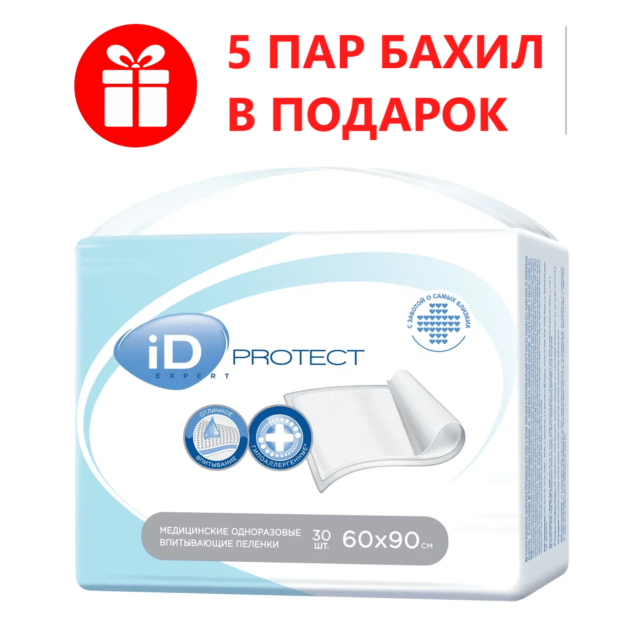 Одноразовые медицинские пеленки ID Protect Expert 60x90, 30 шт + подарок 5 пар бахил интересное: