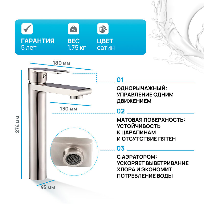 Смеситель для умывальника 35к G1099-22 GAPPO нерж. сталь, высокий, литой, сатин