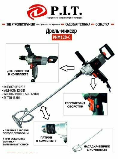 Дрель-миксер P.I.T. PHM120-C (1050Вт, съёмный патрон 16мм, 0-550об/м, шнек, 2 доп. рук.)