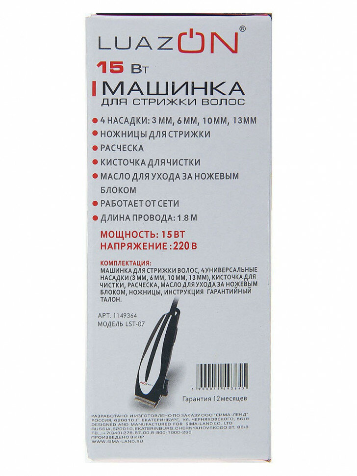 Машинка для стрижки LuazON LST-07, 15 Вт, шнур 1.8 м, насадки 3, 6, 10, 13 мм
