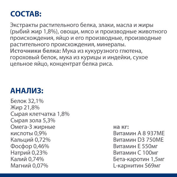 | Состав | Экстракты растительного белка, злаки, масла и жиры (рыбий жир 1,8%), овощи, мясо и производные животного происхождения, яйцо и его производные, производные растительного происхождения, минералы. Источники белка: мука из кукурузного глютена, гороховый белок, мука из мяса курицы и индейки, сухое цельное яйцо, концентрат белка риса. |