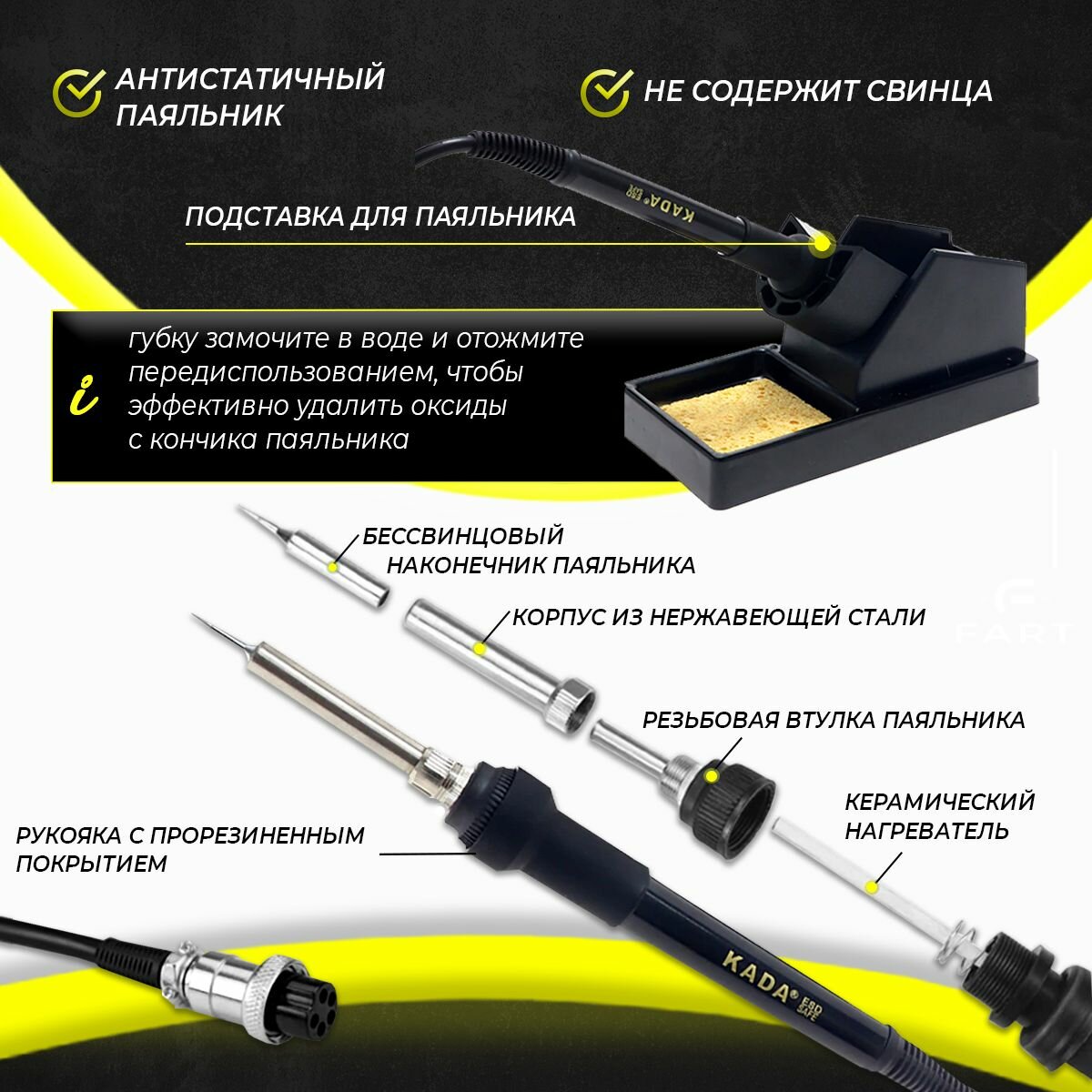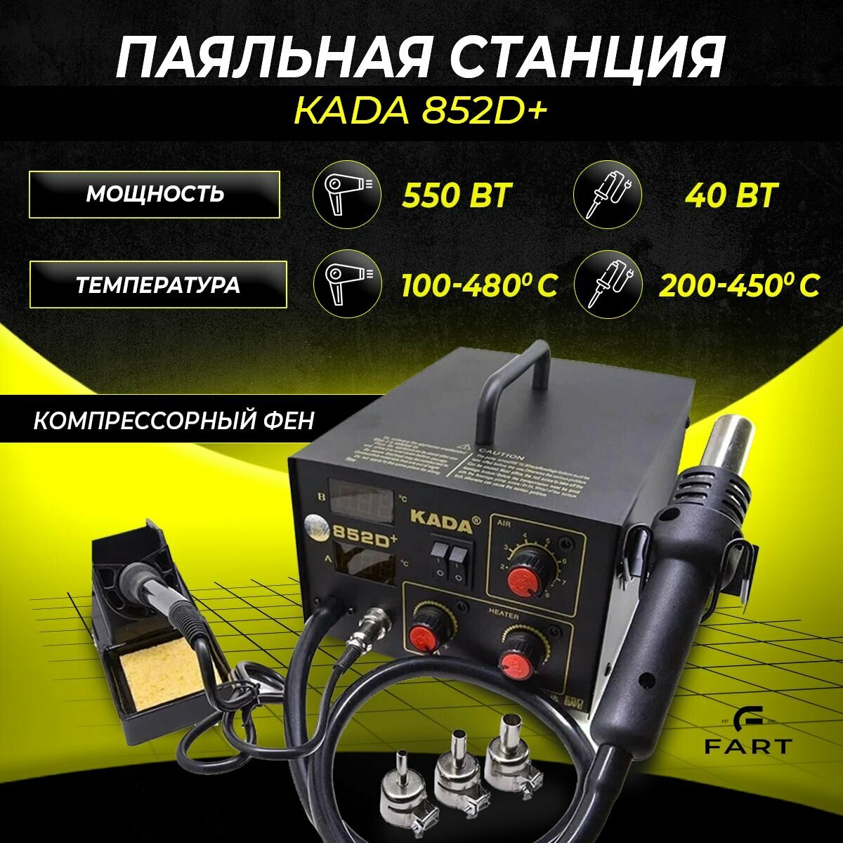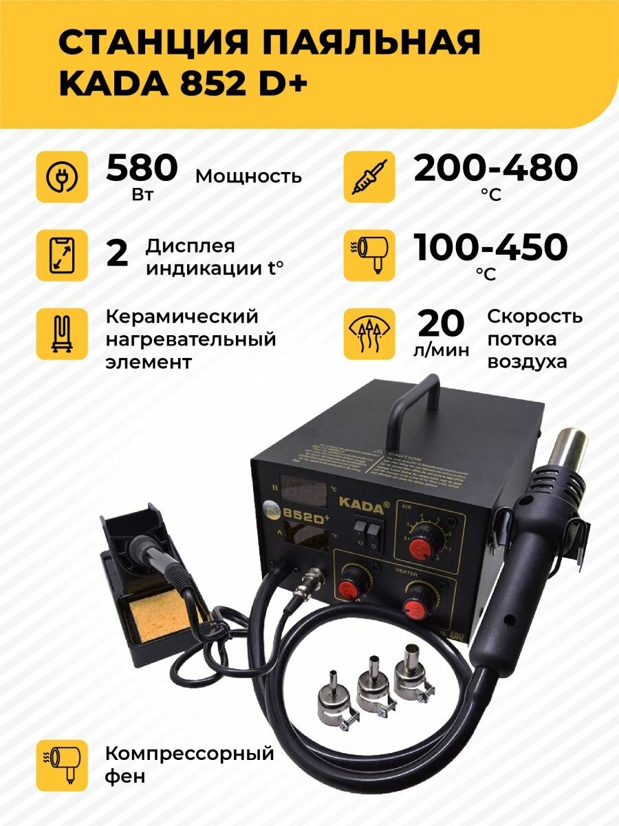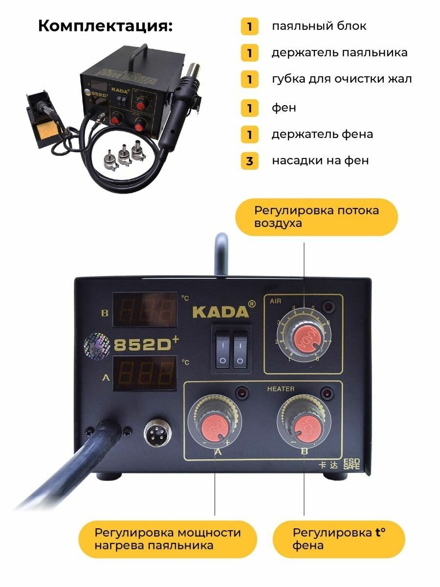 Паяльная станция KADA 852D+ (фен + паяльник, 3 насадки, 2 цифровых дисплея) интересное: