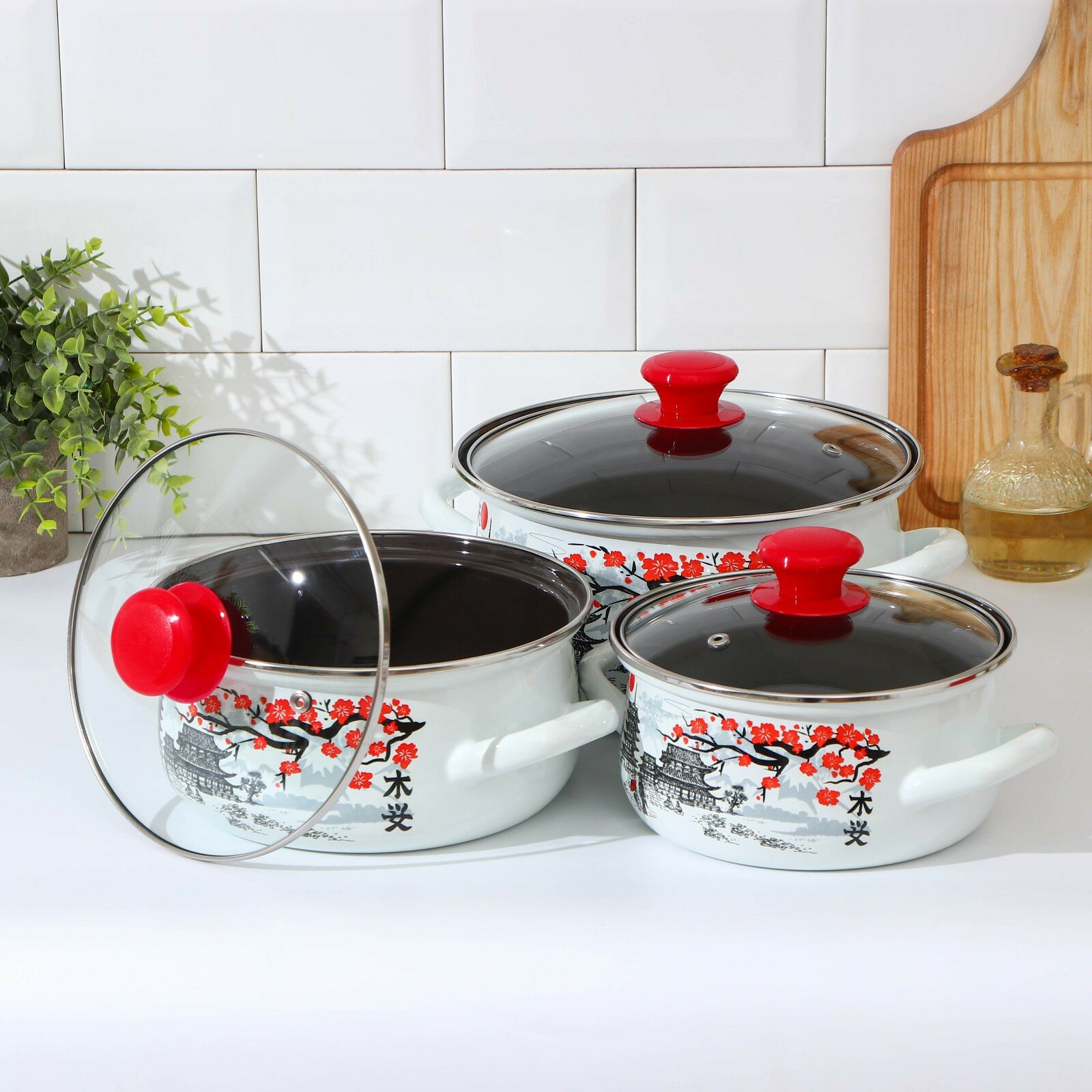 Купить Набор кастрюль «Ветка сакуры», 3 предмета: 1,5 л, 2 л, 3 л, стеклянная крышка