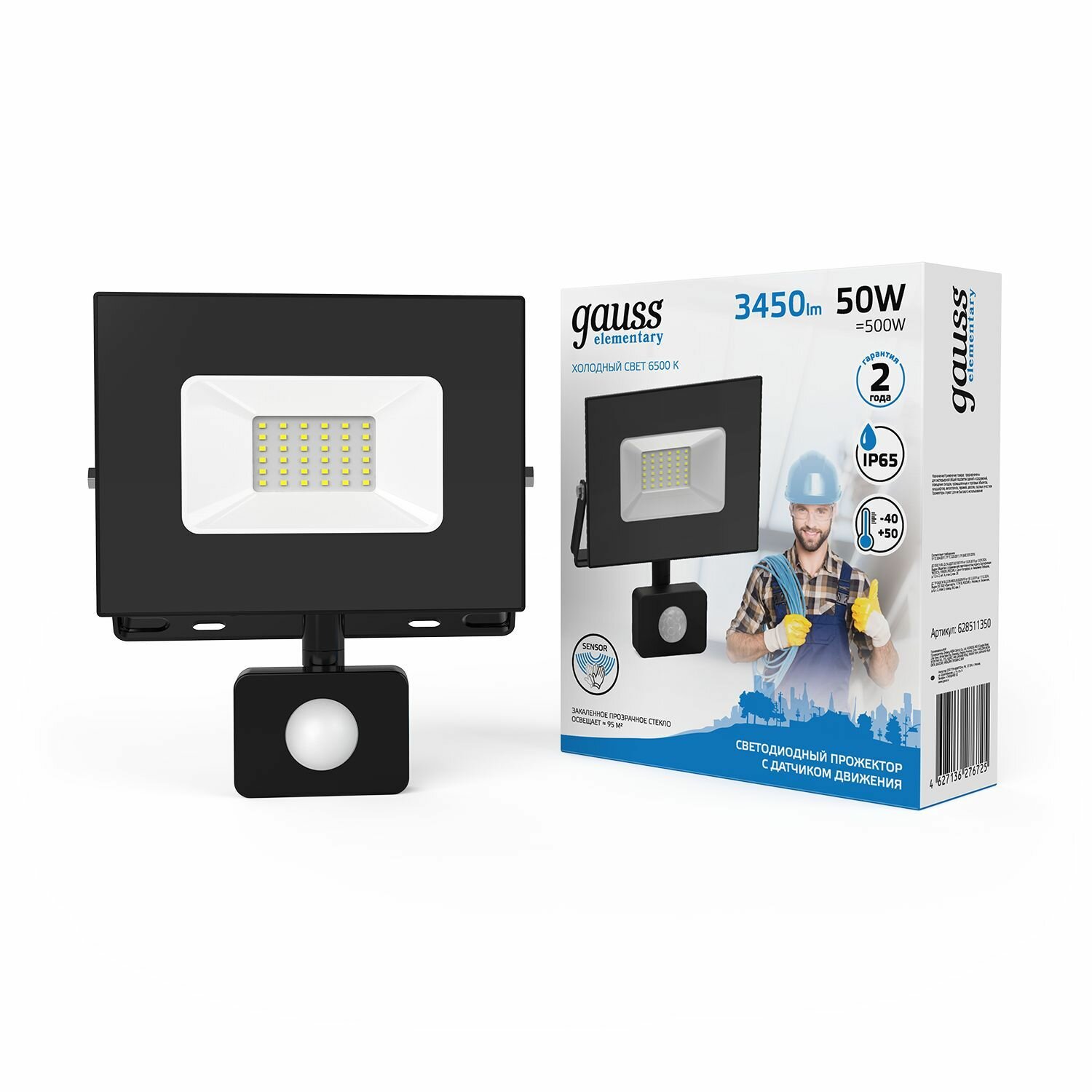 Прожектор GAUSS Elementary 50w 3450lm 6500к 175-265v ip65 черный с датчиком д