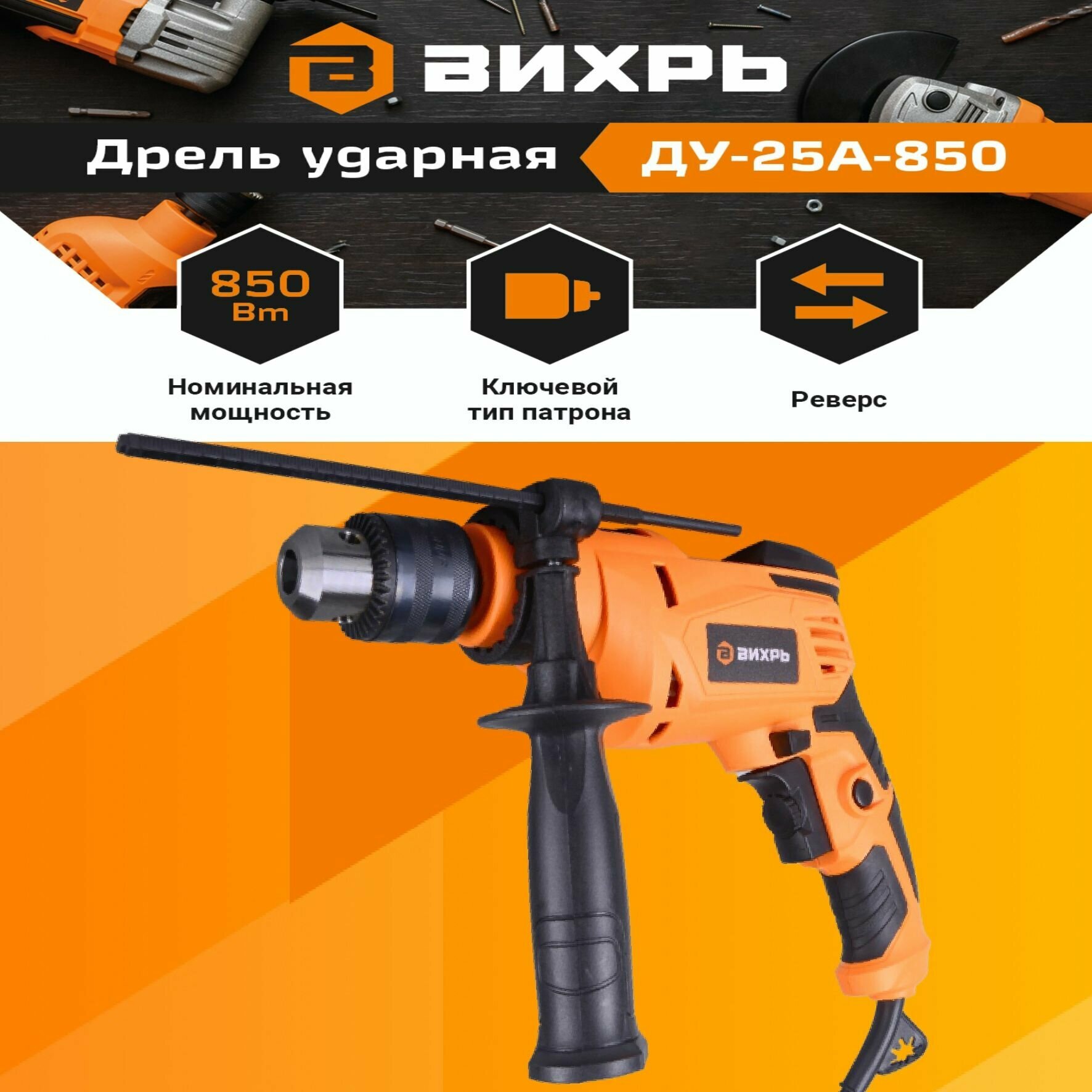 Дрель ударная сетевая ДУ-25А-850 Вихрь, 850Вт, ключевой патрон,реверс