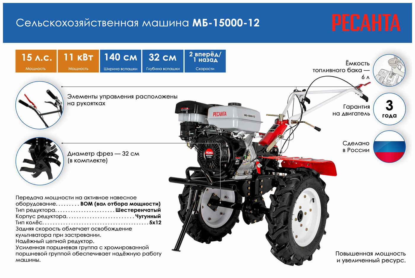 Мотоблок / Сельскохозяйственная машина Ресанта МБ-15000-12 (15 л.с., четырехтактный, бензин, бак – 6 л, ширина – 140 см)