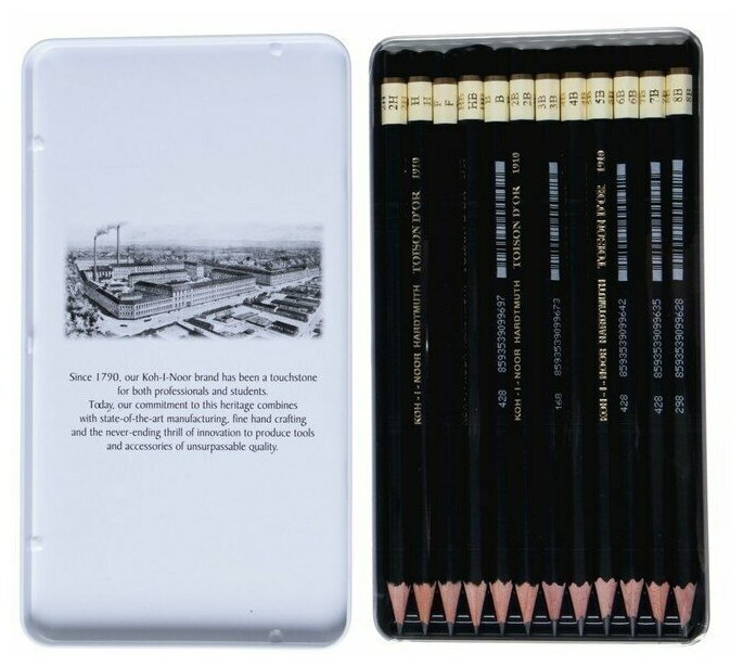 Набор карандашей чернографитных разной твердости ук Koh-i-Noor 1912, 8B-2H, утолщённые, в металлическом пенале интересное:
