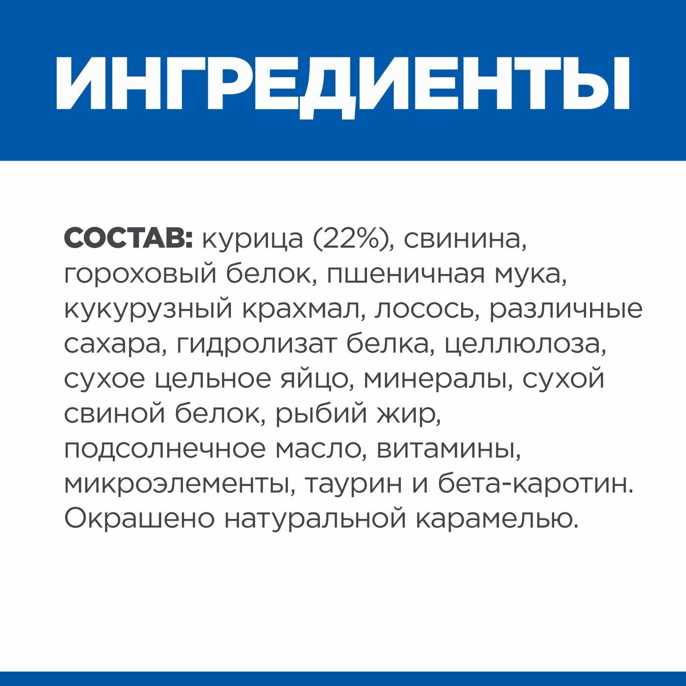 | Состав | мясо и производные животного происхождения, злаки, экстракты растительного белка, рыба и рыбные производные, различные сахара, производные растительного происхождения, яйцо и его производные, минералы, масла и жиры. Подкисляющие мочу вещества: DL-метионин, сульфат кальция, хлорид холина, калия хлорид |