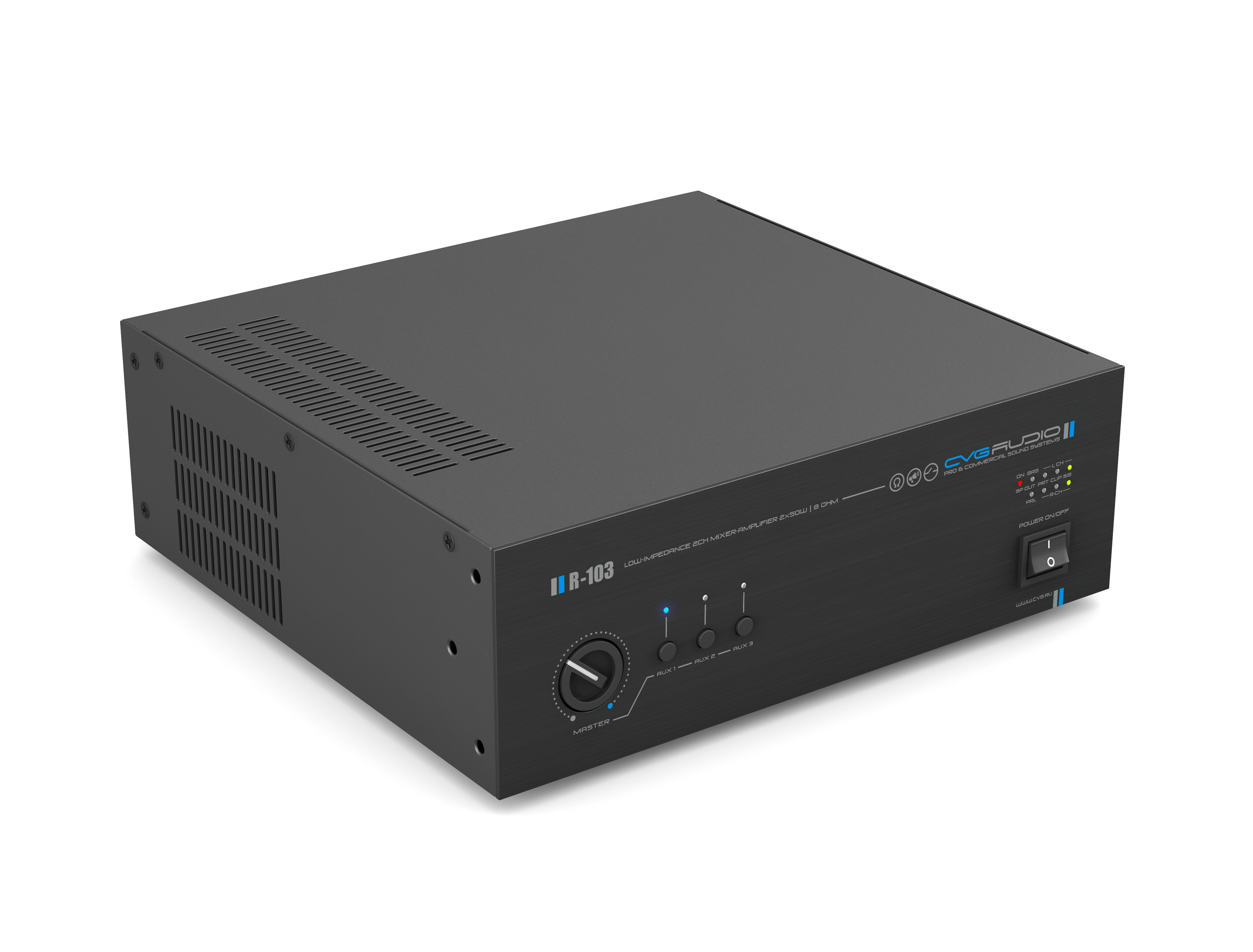 CVGAUDIO R-103 - Профессиональный 2-х канальный стереофонический микшер-усилитель, 2x50W/8ohm, 2x75W/4ohm, 4-8ohm, 3 Line input – 3x2RCA, один Mic input TRS/XLR, EXT.MUTE/ FULL MUTE, stereo/bridge/parallel интересное: