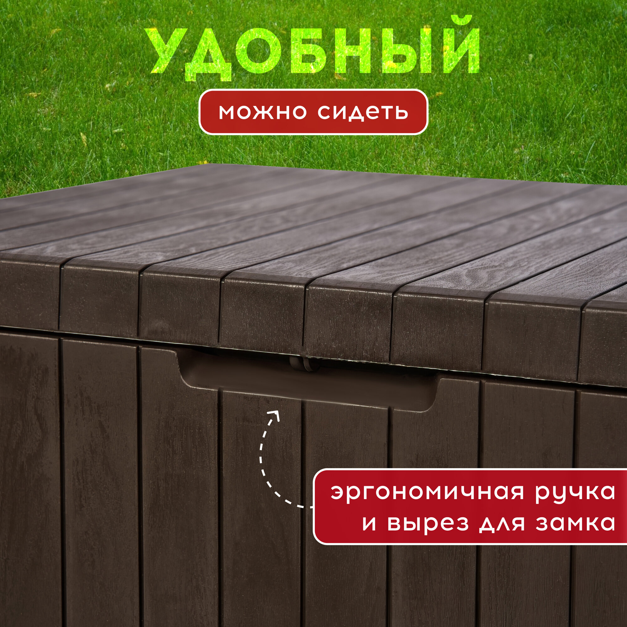 | Плюсы: | Хорошее качество, удобные размеры, как раз под сидушки. Собирается легко, при этом строение ящика не даст ему промокнуть даже при сильном боковом дожде. Есть защелка, которая фиксирует крышку в случае если подушки немного торчат из ящика. |