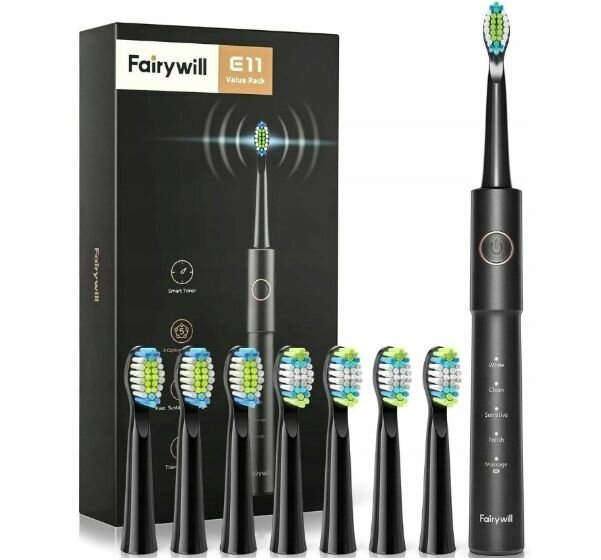 Электрическая зубная щетка Fairywill E11, 8 сменных насадок, 5 режимов для чистки полости рта,черная