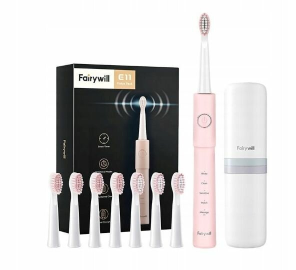 Электрическая зубная щетка Fairywill E11, 8 сменных насадок, 5 режимов для чистки полости рта, розовая