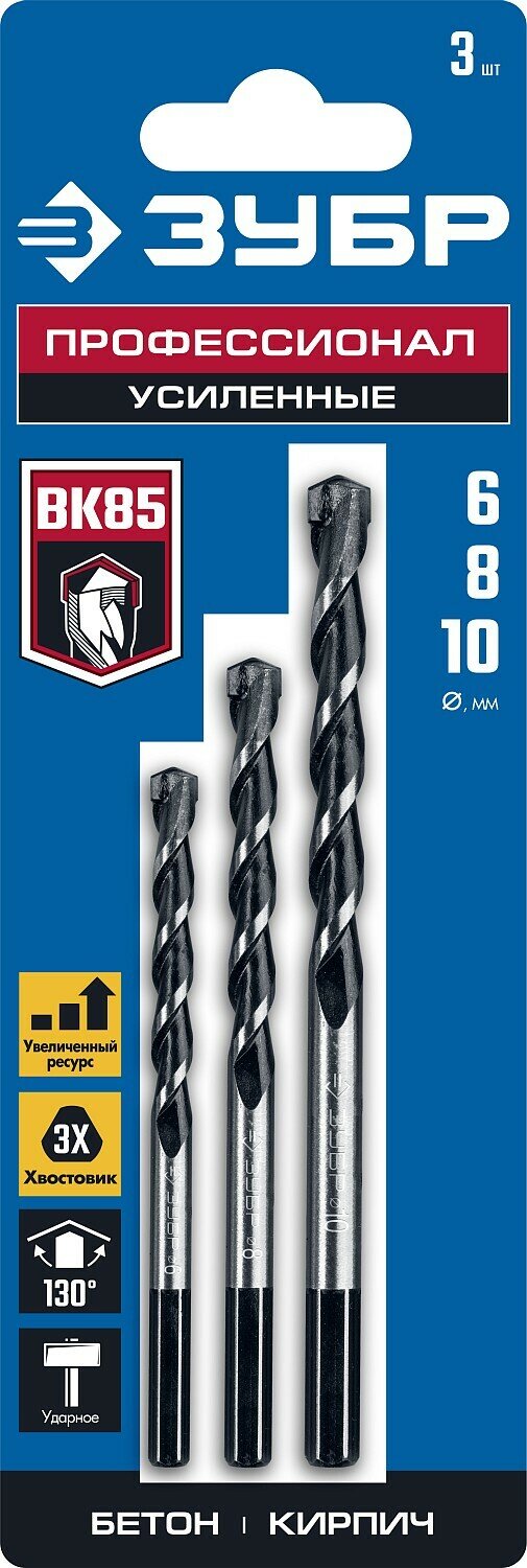ЗУБР СУПЕР-6 3 шт: d 5-6-8 мм набор сверл по бетону с шестигранным хвостовиком профессионал 2916-H3