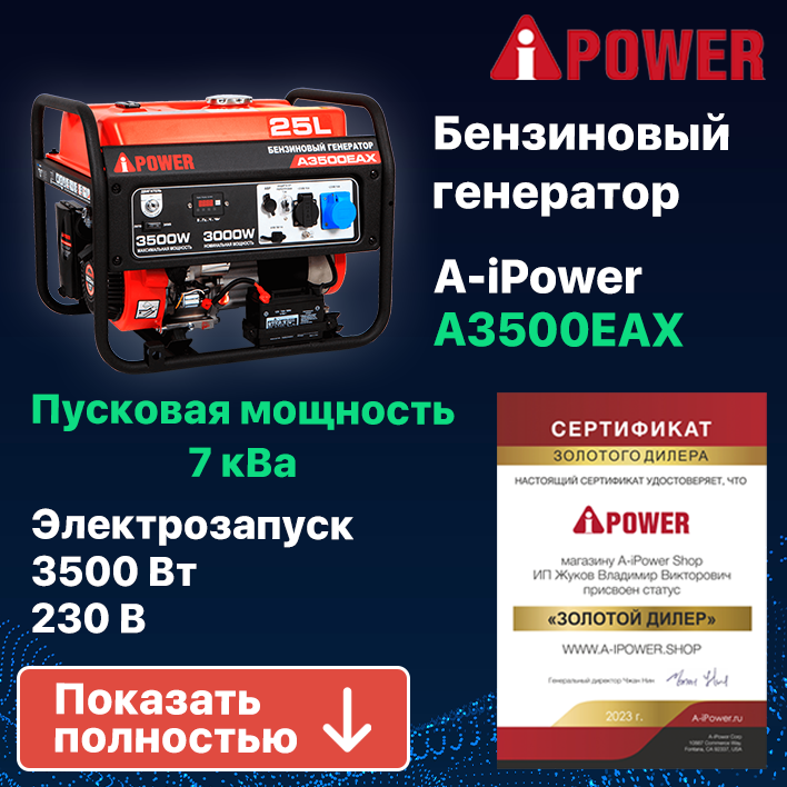Ниже Вы можете прочитать отзывы на A-ipower Генератор бензиновый A-iPower A3500ЕАХ 3кВт, 230В/50Гц, электростартер, ознакомится с подробными характеристиками, посмотреть интересные обзоры и фотографии на A-ipower Генератор бензиновый A-iPower A3500ЕАХ 3кВт, 230В/50Гц, электростартер.